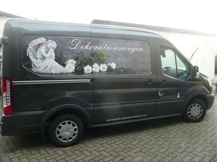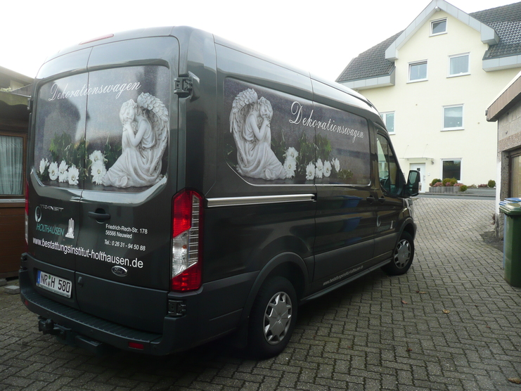 Als Dekorationswagen verwenden wir einen Ford-Transit. Er ist von den Bestattungswagen leicht zu unterscheiden, da er als Dekorationswagen beschriftet ist.